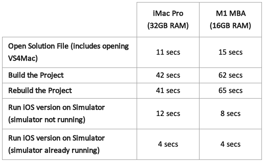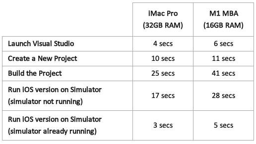 We are ready to start developing using Visual Studio for Mac on the new M1 machine now. There is no change to how you worked earlier. Everything remains the same. Just launch VS4Mac, create a new XF application and run it in either iOS simulator or Android emulator. Business as usual, really. On the performance side, it seems that my iMac Pro is slightly faster than the M1 MBA. Here are the results comparing the two: